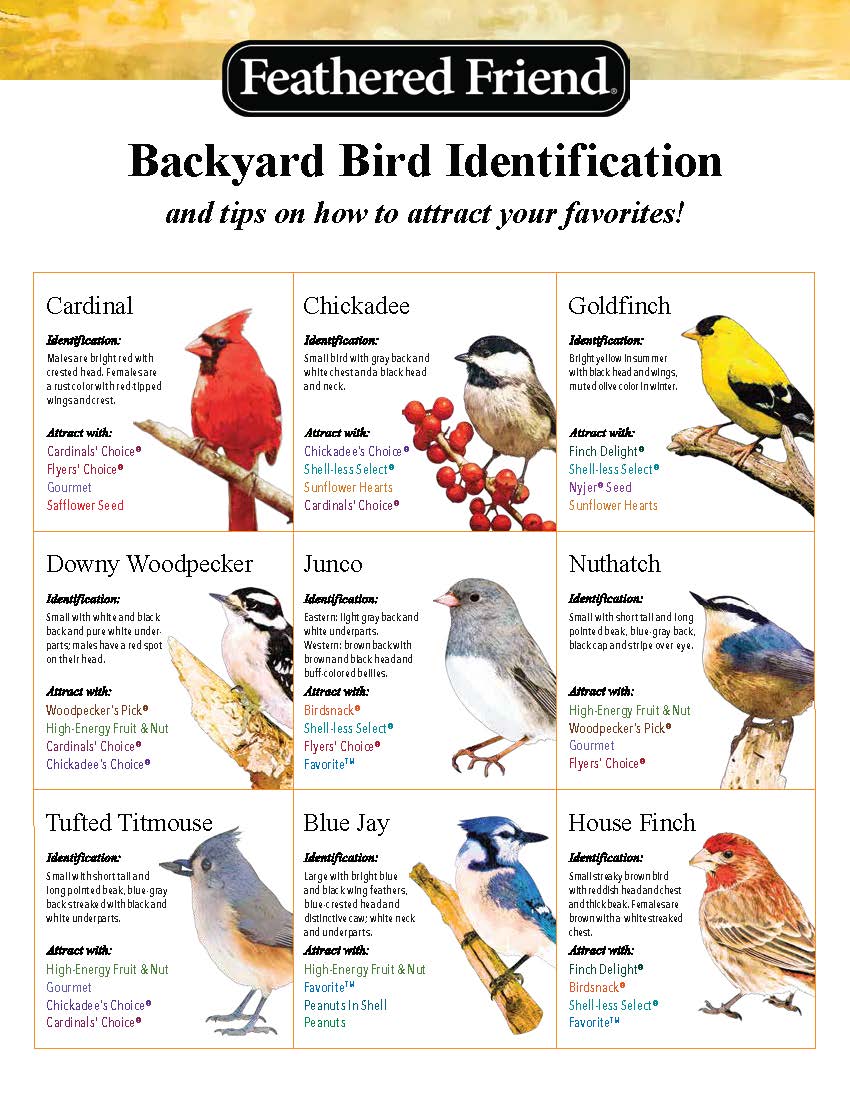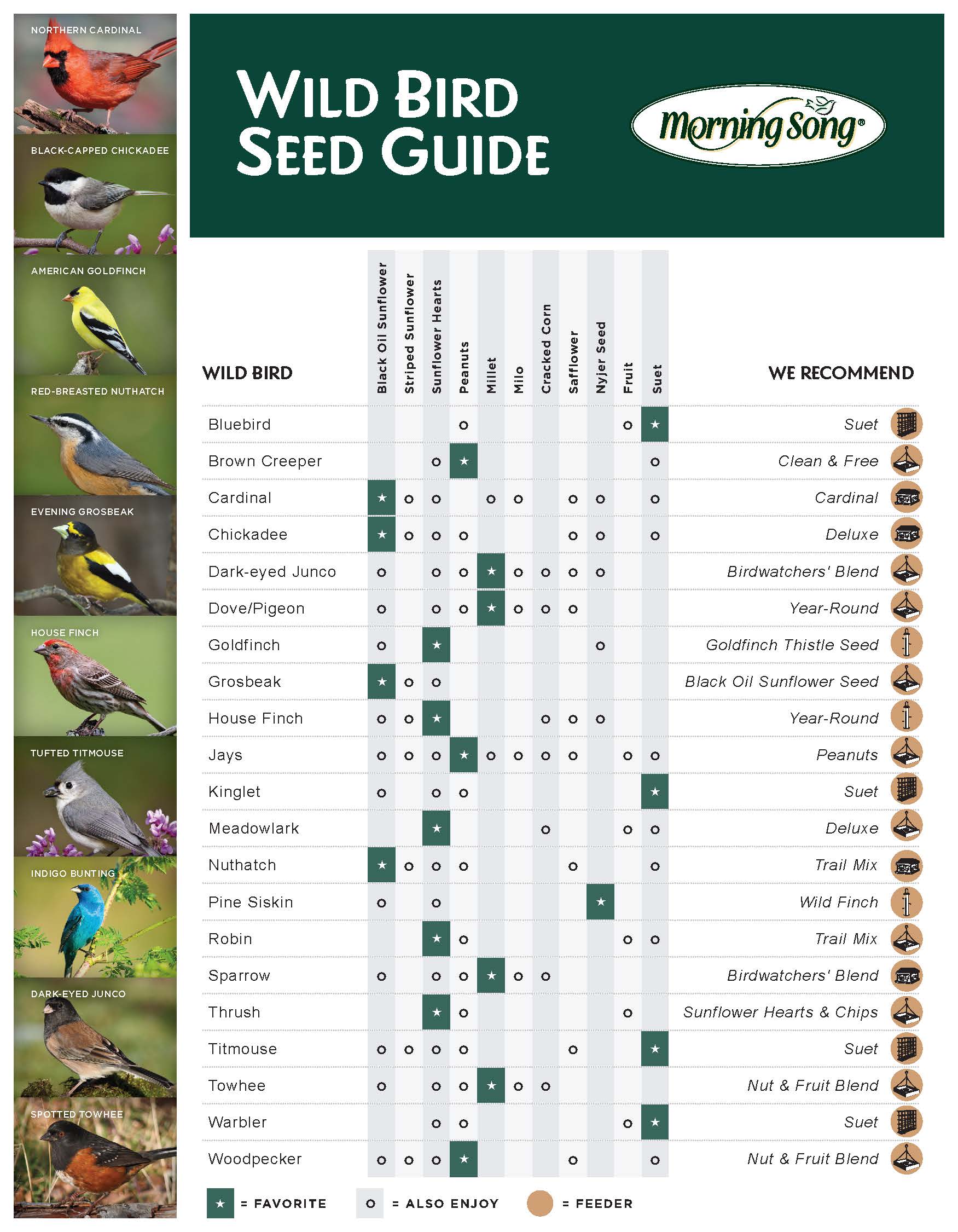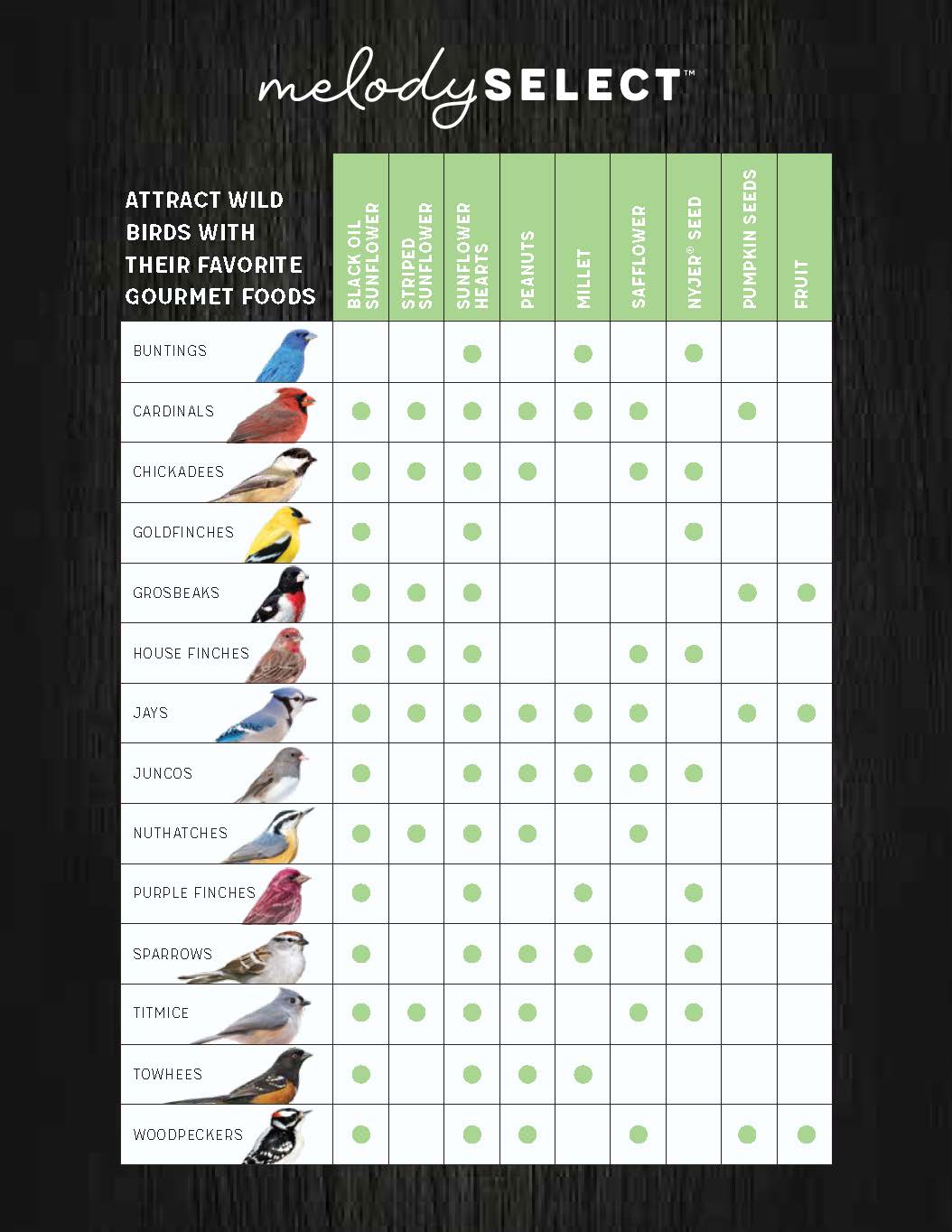 Attracts finches, nuthatches, sparrows, juncos, chickadees, cardinals, and buntings and contains White Proso Millet, Black Oil Sunflower Seed, Cracked Corn, Safflower Seed, Chipped Sunflower Seed, Peanuts, Striped Sunflower Seed