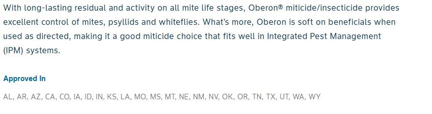 Rare Ag Products carries Oberon® miticide/insecticide, with the active ingredient Spiromesifen, which is specifically effective against two-spotted spider mites and banks grass mites. Oberon has its highest activity against the immature stages (nymphs) of pest development.